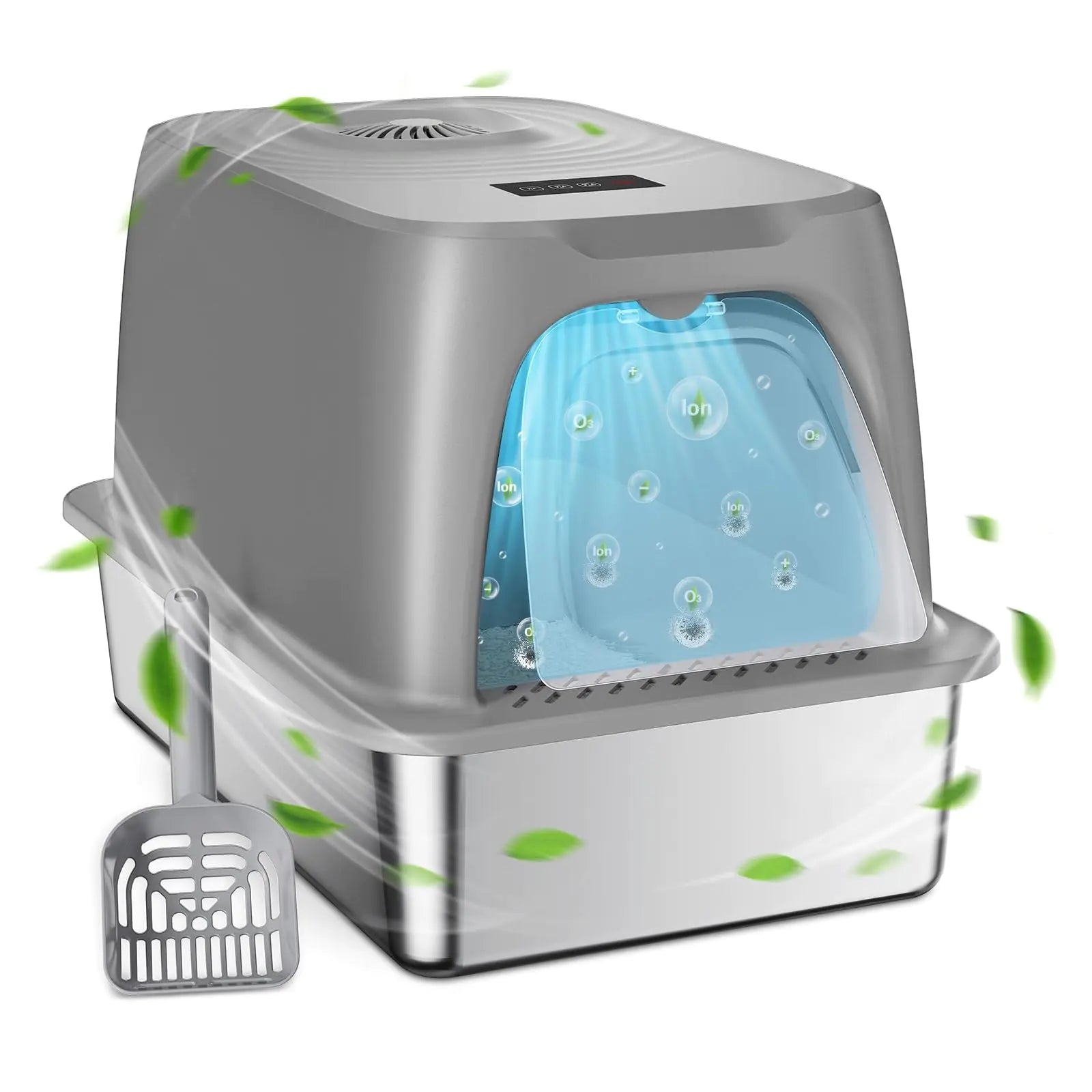 [【No Odor Diffusion Cat Privacy’s Guardians:】With 16.1 inch high side this fully enclosed litter box prevents cat litter spatter and urine leakage effectively cut down the spread of odors and keep the air fresh and surrounding areas clean at home. Enclosed space also protects the privacy of cats let them feel at ease and safe when using the covered litter box 【Easy Cleaning and Odor Free Material】Made from premium stainless steel its non-stick surface simplifies cleaning with a quick rinse while its non-porous nature prevents odors from lingering ensuring it remains clean and odor-free. Our stainless steel litter box is built to last resisting rust and scratches from cat claws 【Roomy for Big Cats or Multiples】With a spacious 20L capacity and dimensions of 24" L x 16" W x 16" H our cat litter box with lid accommodates cats of all sizes including larger or multiple cats providing ample space for comfortable use. Note: This litter box is equipped with a charging cable that needs to be plugged into a power supply "【No Urine or Odor Leakage】Our covered litter box offers unparalleled containment with the top cover completely overlapping the bottom significantly reducing the risk of urine leakage and preventing odors from spreading out. Note: the flip-up door can be removed to suit your cats preferences" 【Convenient and Thoughtfully Designed】From the user-friendly touchscreen controls to the infrared sensors that pause the system when your cat enters our kitty litter box is designed with convenience in mind. The filter pedal design keeps litter tracking at bay while the complimentary scoop makes cleaning a breeze]